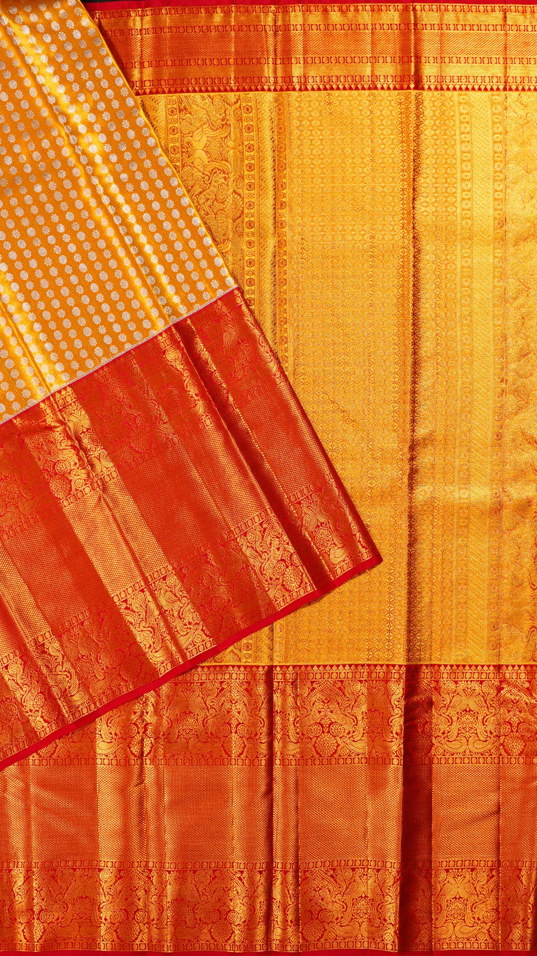 Rich gold Kanchipattu silk saree adorned with allover buttas, enhanced by a grand contrast gold tissue zari border with deep red accents, ideal for weddings.