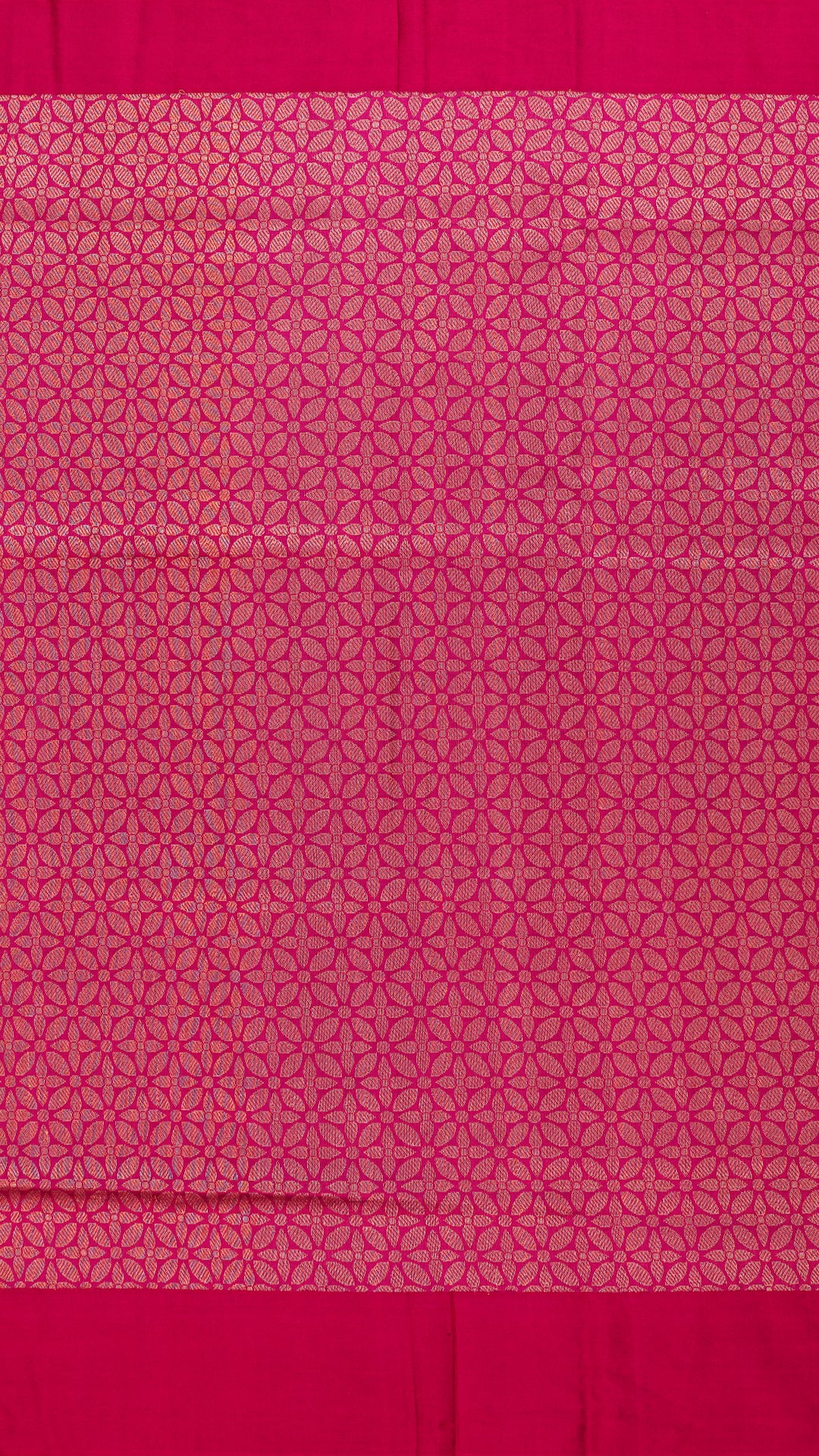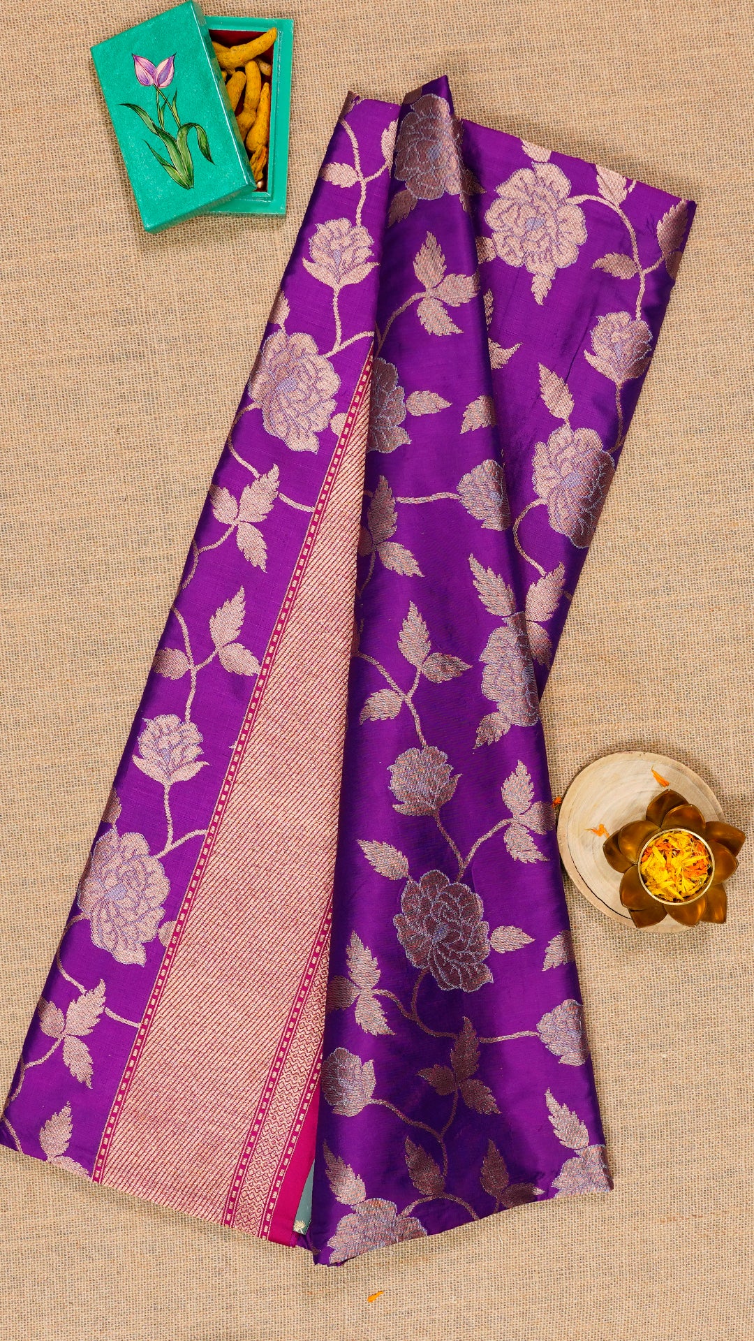 Rich violet Banaras silk saree featuring dark pink contrast brocade, medium allover design, and elegant cross zari lines for festive elegance.
