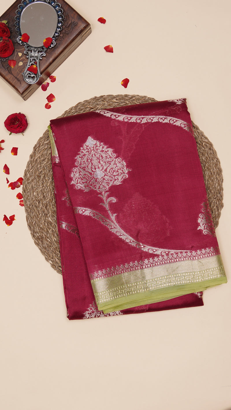 Dark Red Chiniya Silk Saree with Pista Green Zari Border | Vaarahi Silks