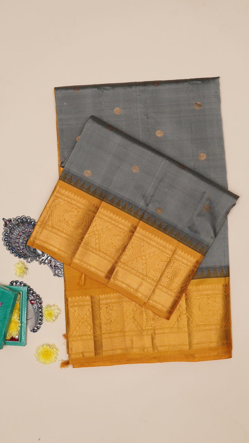 Drape this Dark Grey Gadwal Silk saree with all-over buta and contrast zari border, perfect for festive, traditional, and special occasions.