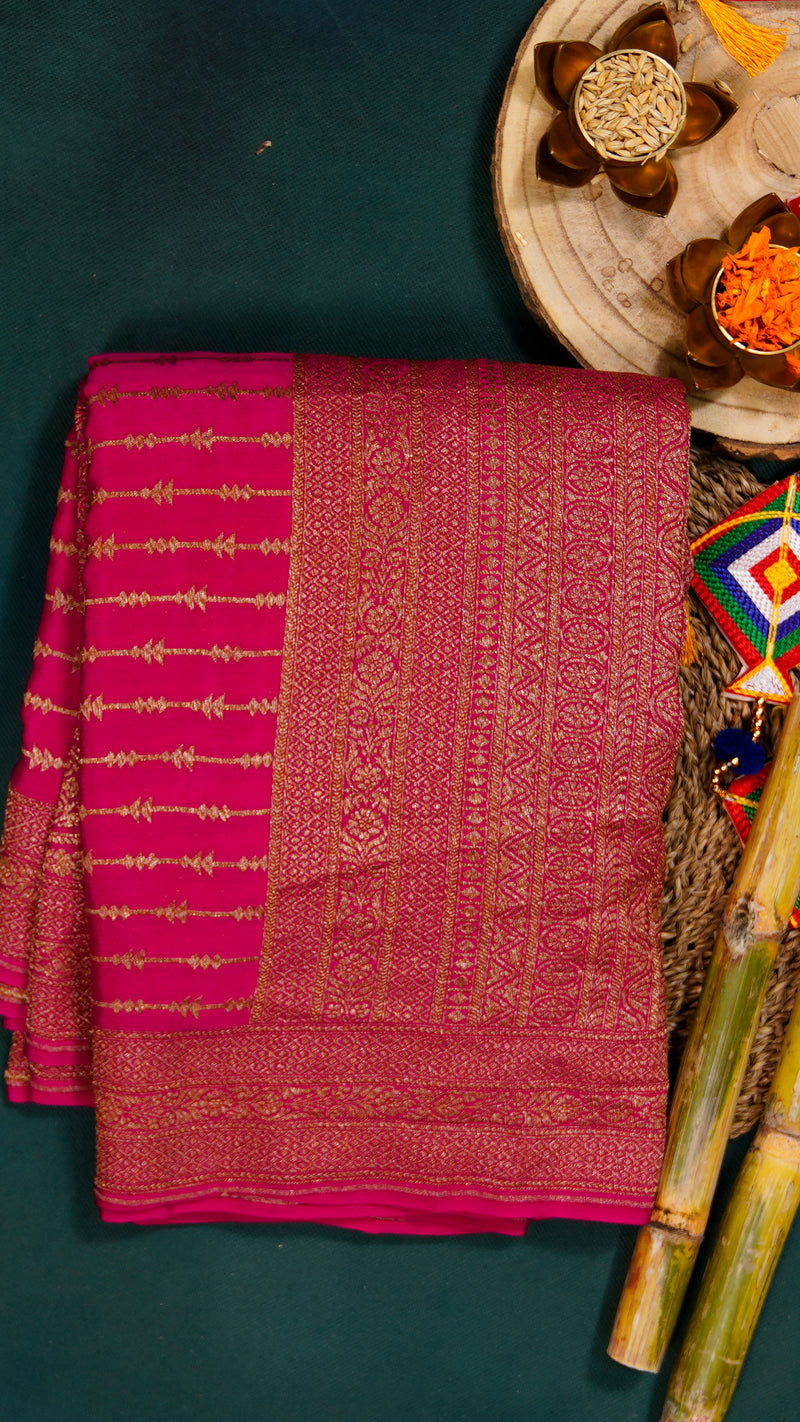 Rani pink Banaras georget silk saree with allover geometric pattern, self buttas and border, adorned with zari—ideal for weddings and celebrations.