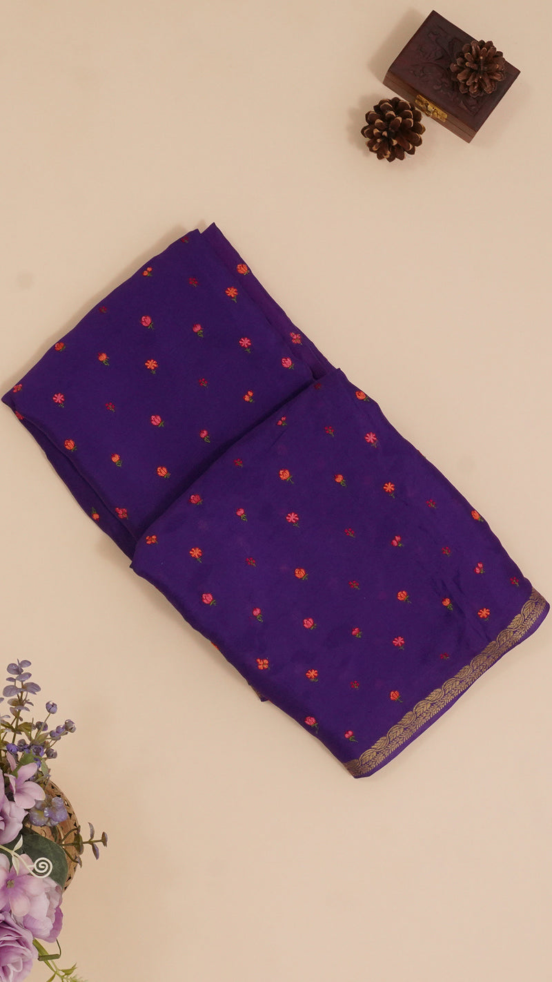 Beautiful Violet Georgette Silk Saree featuring allover buttas and small gold self zari border. Includes contrasting blouse with intricate buttas for a stylish look