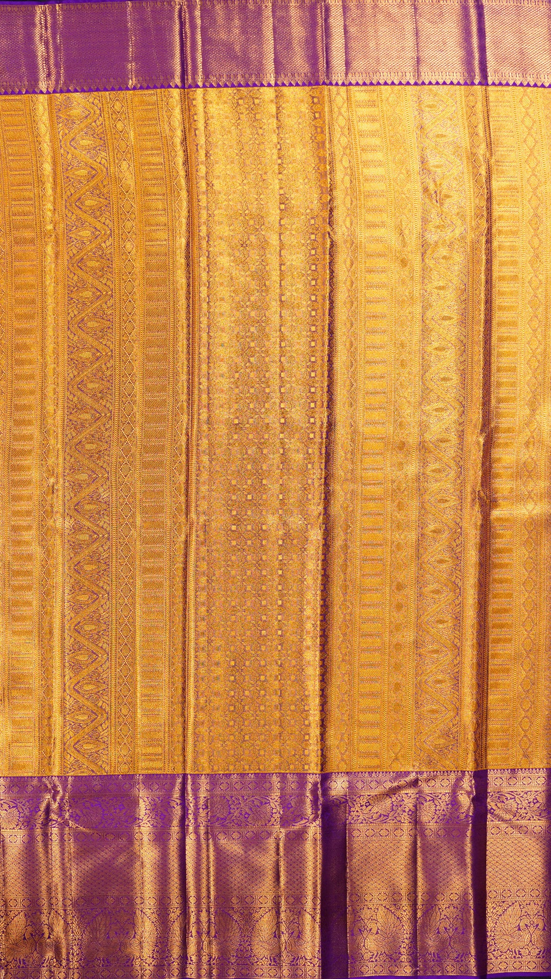Premium multi colour Kanchipattu silk saree featuring all over geometric patterns, rich gold tissue zari border with purple contrast, perfect for weddings and festivals.