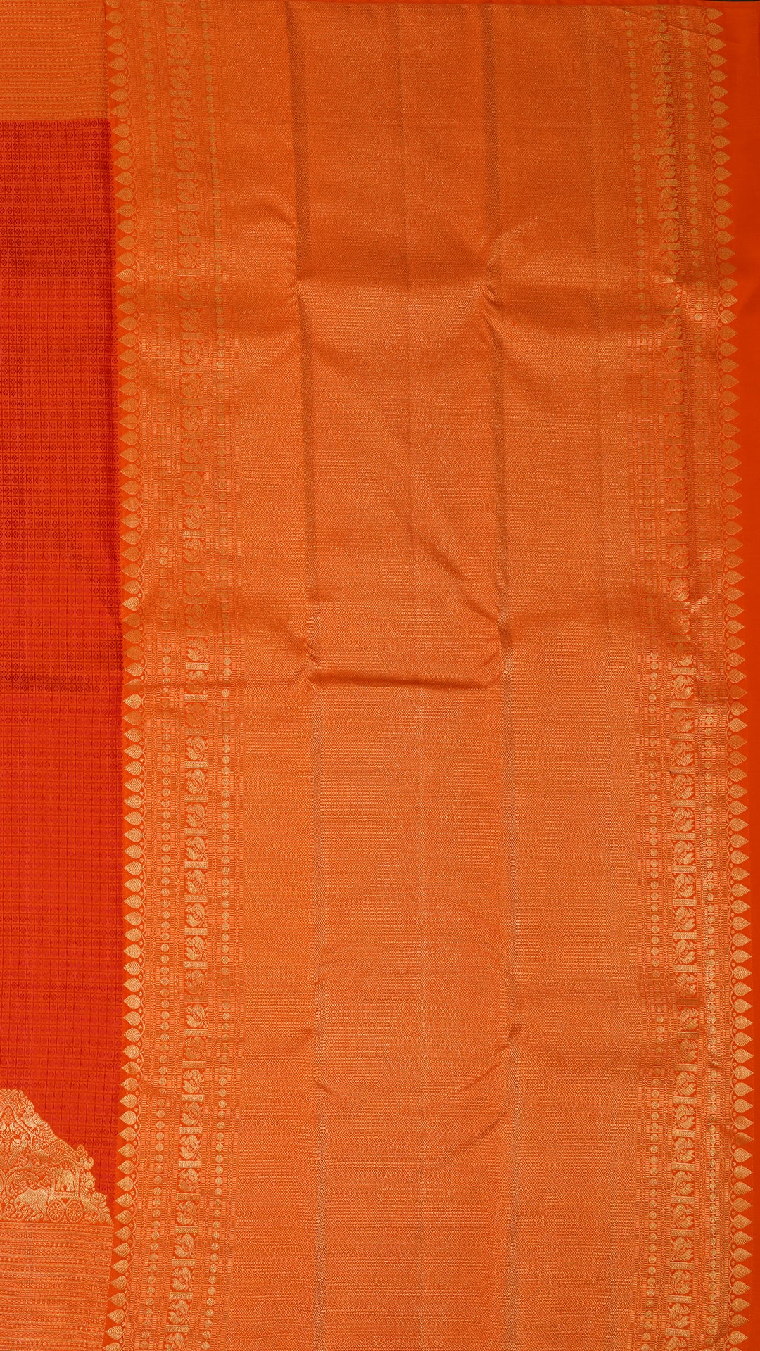 Elegant orange Kanchi Pattu silk saree featuring a rich designer zari border and intricate all-over weave — perfect for weddings and festive celebrations.