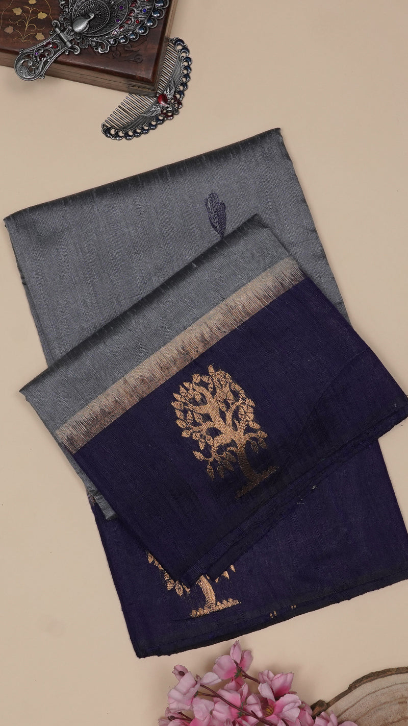Shop Elephant Grey Jute Silk saree with contrast zari and motifs border, featuring all-over buta. Ideal for festive, casual, and traditional occasions.