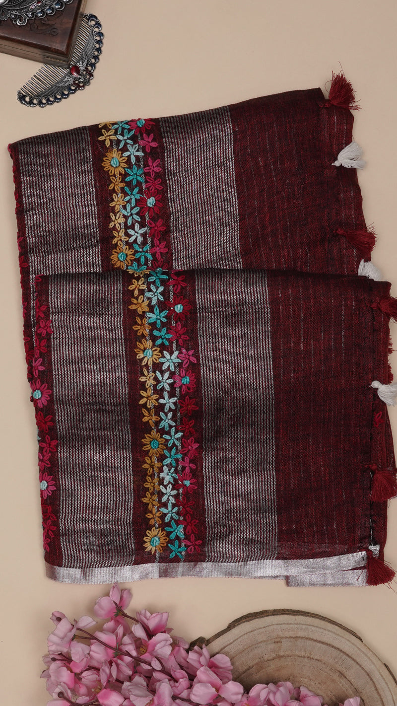 Drape this Maroon Linen Silk saree with self stripes, buta border, and 1-inch silver zari with thread embroidery, perfect for festive and casual occasions.