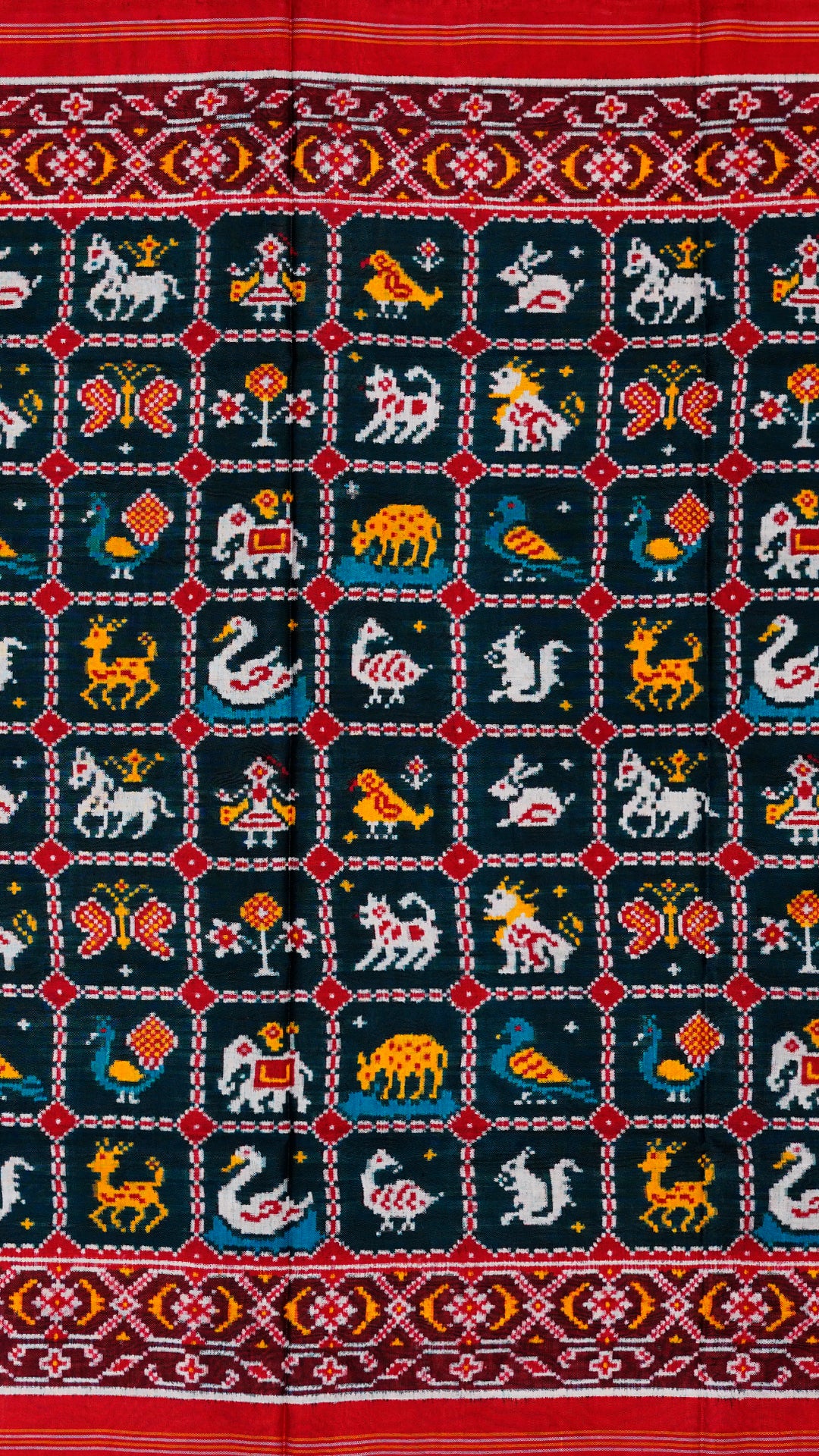 Bluish green Patan Patola silk saree with red double ikkat design and multicAolour striped border—perfect for weddings, parties, and celebrations.