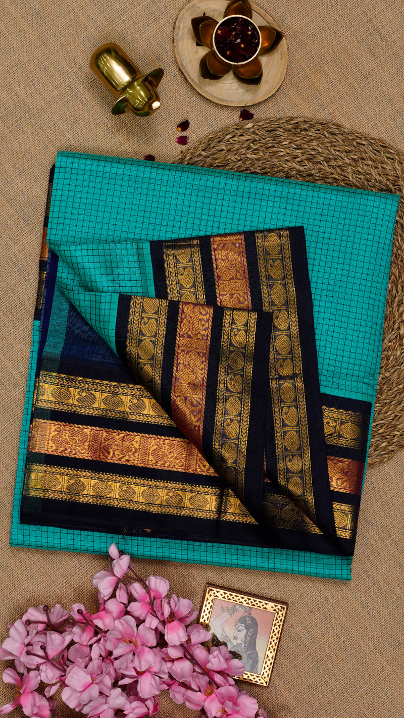 Elevate your ethnic wardrobe with this Kuppadam silk saree showcasing all over small checks and a bold gold zari border, perfect for celebrations.