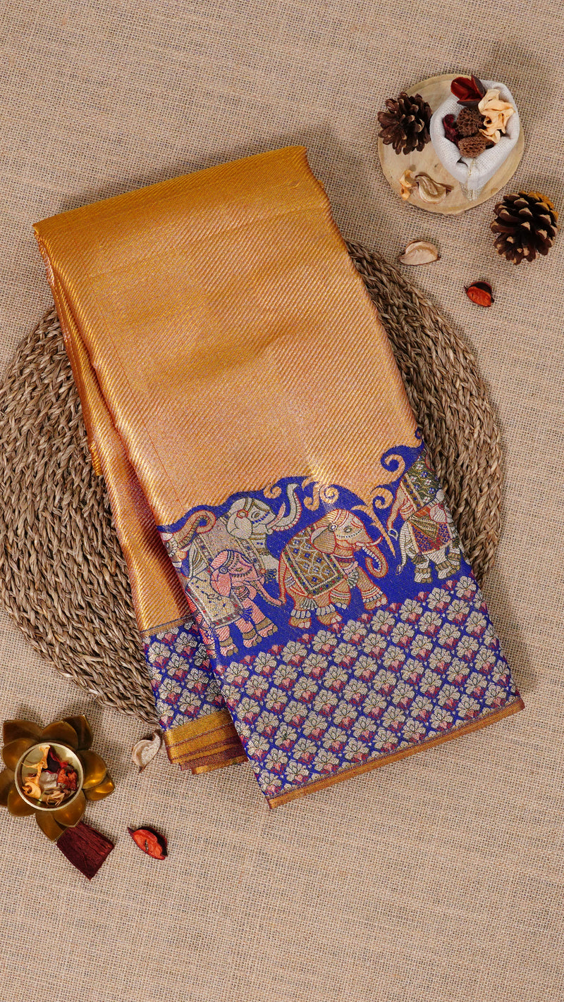 Radiate grandeur in this Gold Kanchi Silk Saree featuring small gold cross lines and a majestic Ink Blue border with elephant motifs. The self-border pallu enhances its royal appeal.