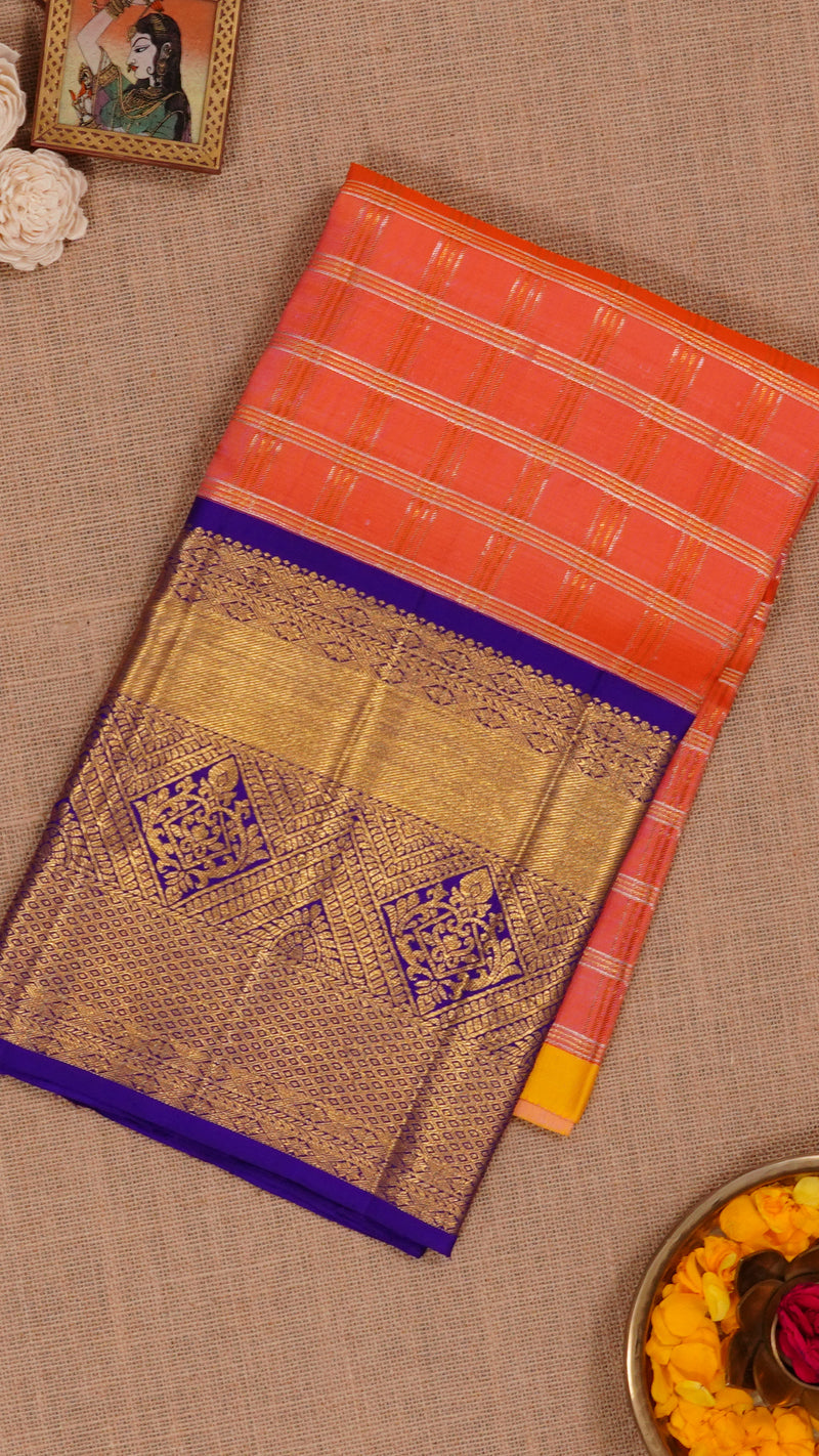 Infuse festive charm with this bright Orange silk Pattu Pavada featuring a traditional checks pattern. Complemented with a deep Blue designer border with zari work, this ensemble is ideal for joyful celebrations.