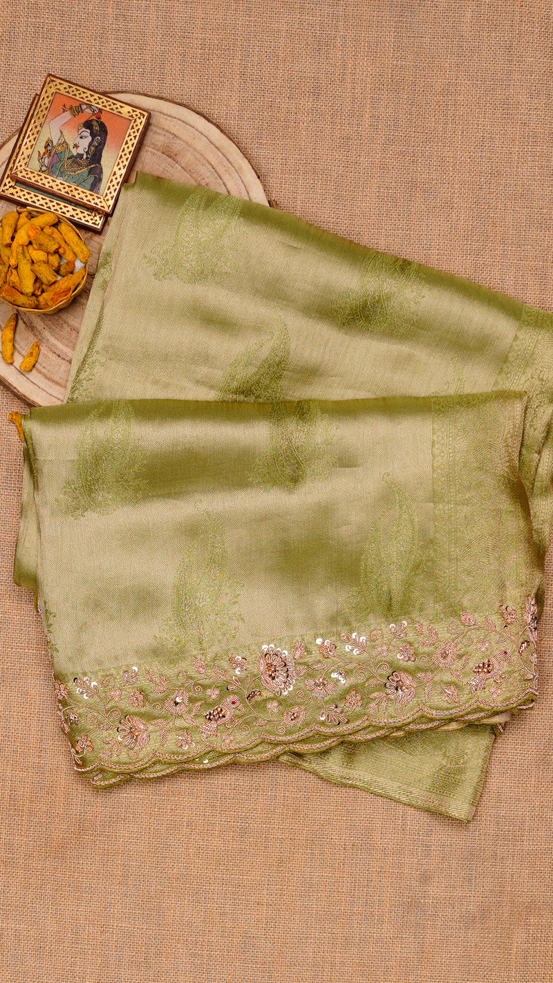 Beautiful pista green Banarasi kora saree featuring allover weave and refined zardosi embroidered border, ideal for weddings and festive functions.